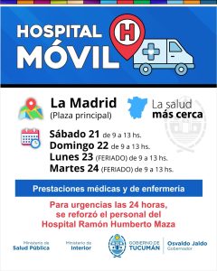 En el marco del operativo sanitario desplegado en la Plaza Principal de La Madrid, el Hospital Móvil continúa brindando atención médica para garantizar el acceso a la salud de la población afectada por la contingencia.