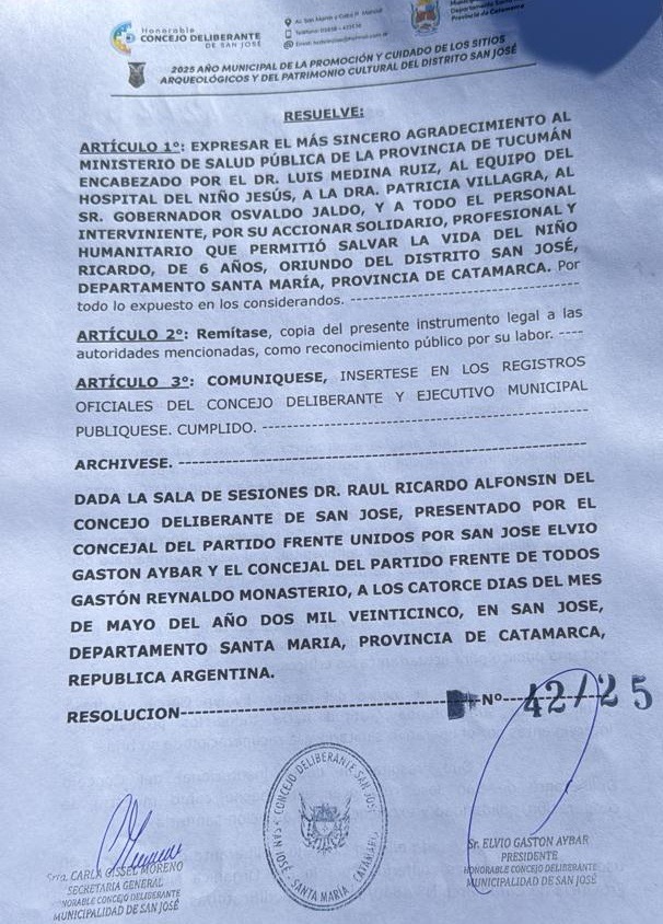La resolución fue entregada por el gobernador Raúl Jalil y la ministra de Salud de Catamarca, doctora Johana Carrizo, al gobernador Osvaldo Jaldo y al ministro de Salud Pública, doctor Luis Medina Ruiz, en agradecimiento por los servicios dispensados a Ricardo, un niño de siete años de Santa María que fue dado de alta tras superar una grave hemorragia interna a causa de un accidente en moto sucedido el 30 de abril.