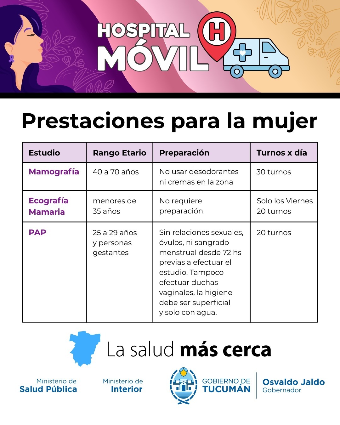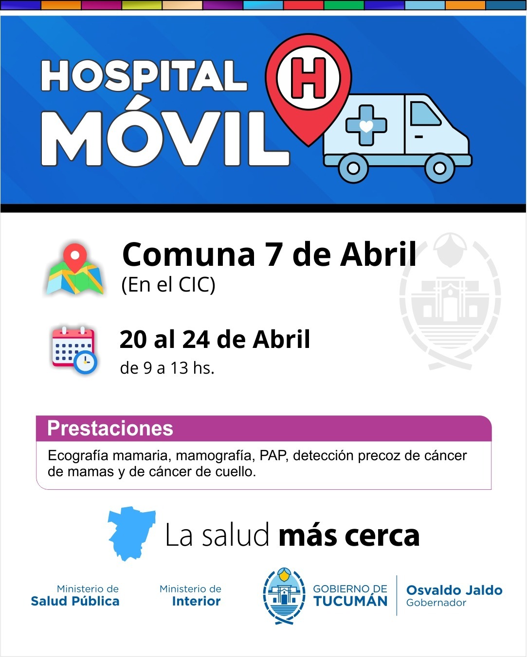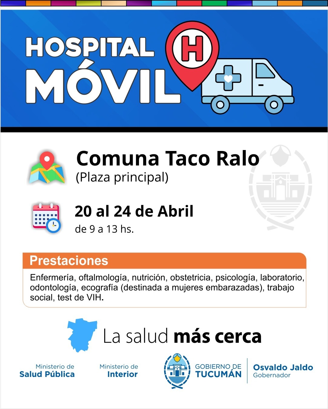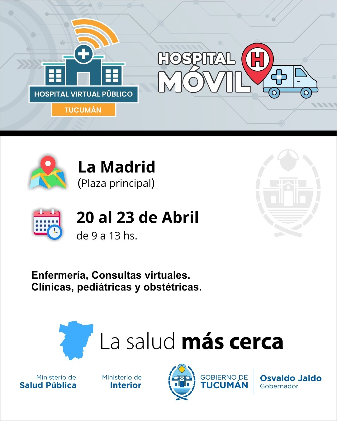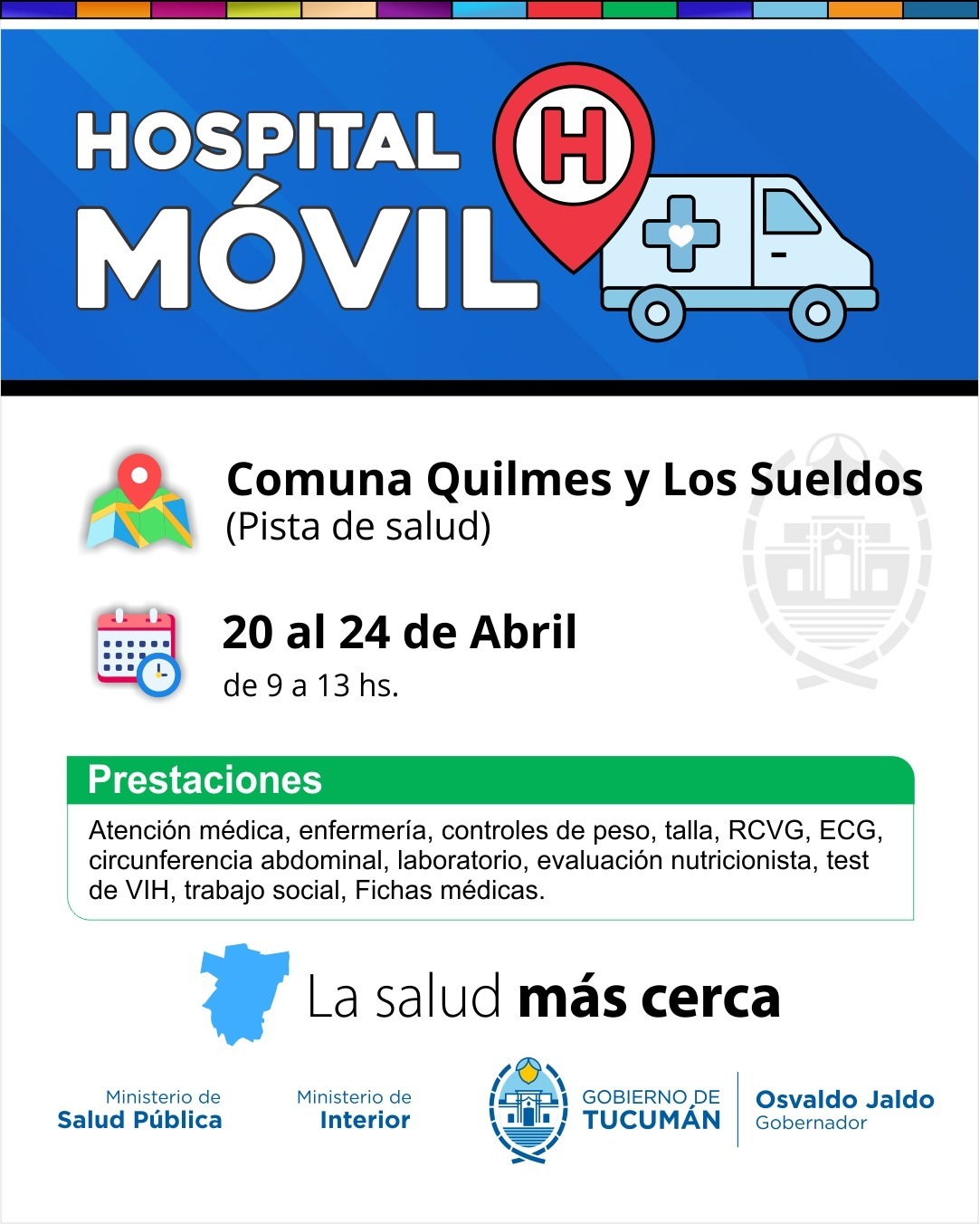 El ministro de Salud Pública, doctor Luis Medina Ruiz, anunció que el Hospital Móvil, continuará su recorrido territorial y desde el 20 al 24 de abril, se instalará en las plazas principales de Quilmes y los Sueldos, Taco Ralo, 7 de Abril y La Madrid (20 al 23 de abril) en el marco de la iniciativa “La Salud Más Cerca”, impulsada por el gobernador, contador Osvaldo Jaldo.