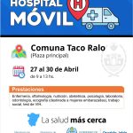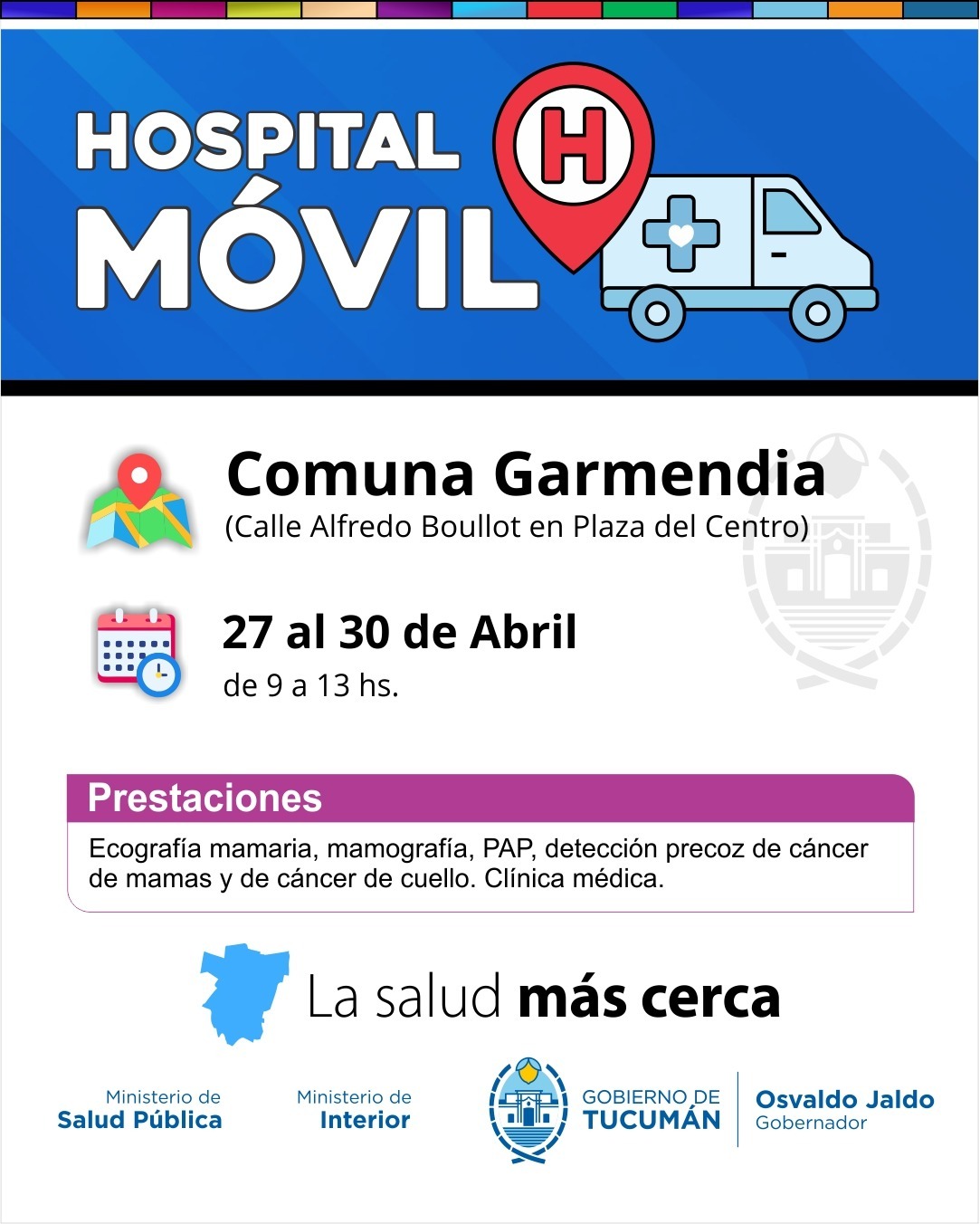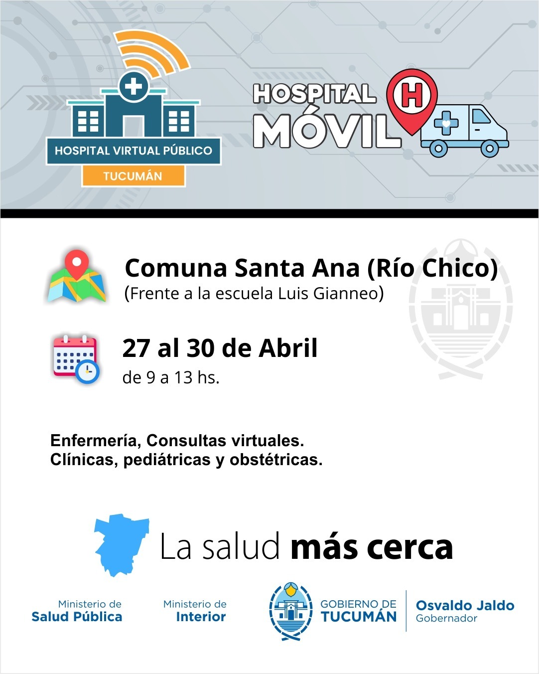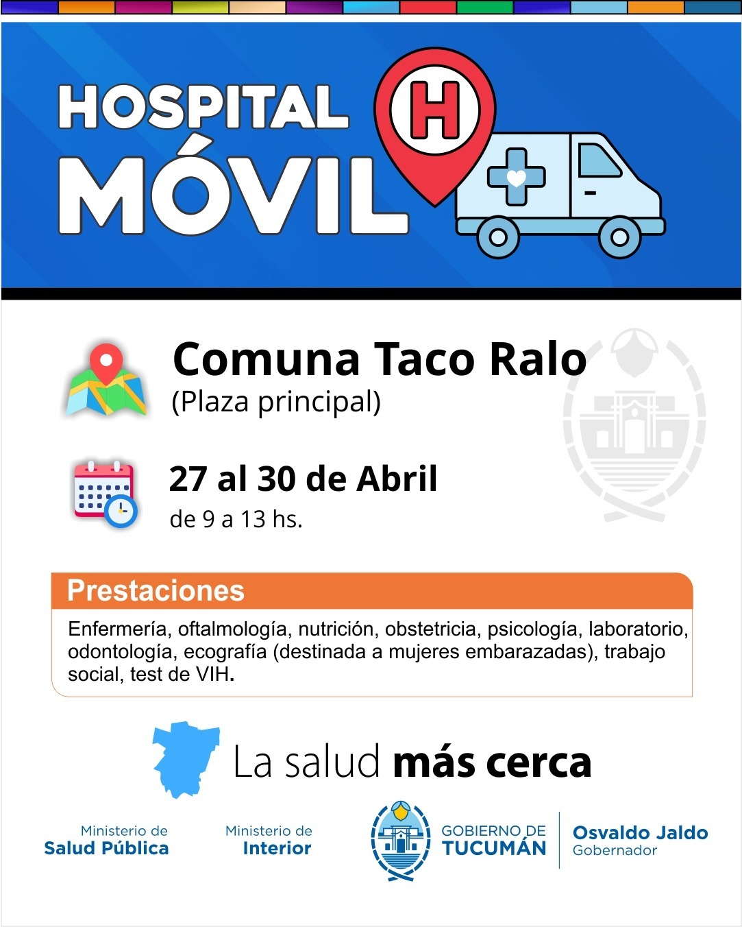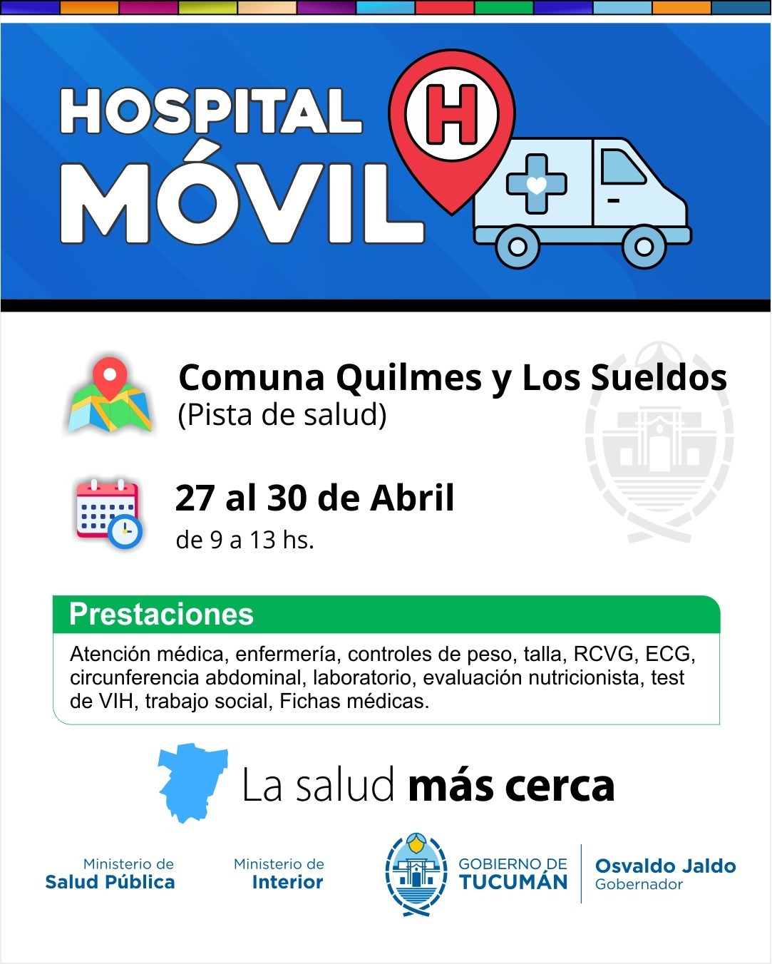 El ministro de Salud Pública, doctor Luis Medina Ruiz, anunció que el Hospital Móvil, continuará su recorrido territorial y desde el 27 al 30 de abril, se instalará en las plazas principales de Quilmes y los Sueldos, Taco Ralo, Garmendia y Santa Ana, en el marco de la iniciativa “La Salud Más Cerca”, impulsada por el gobernador Osvaldo Jaldo.
